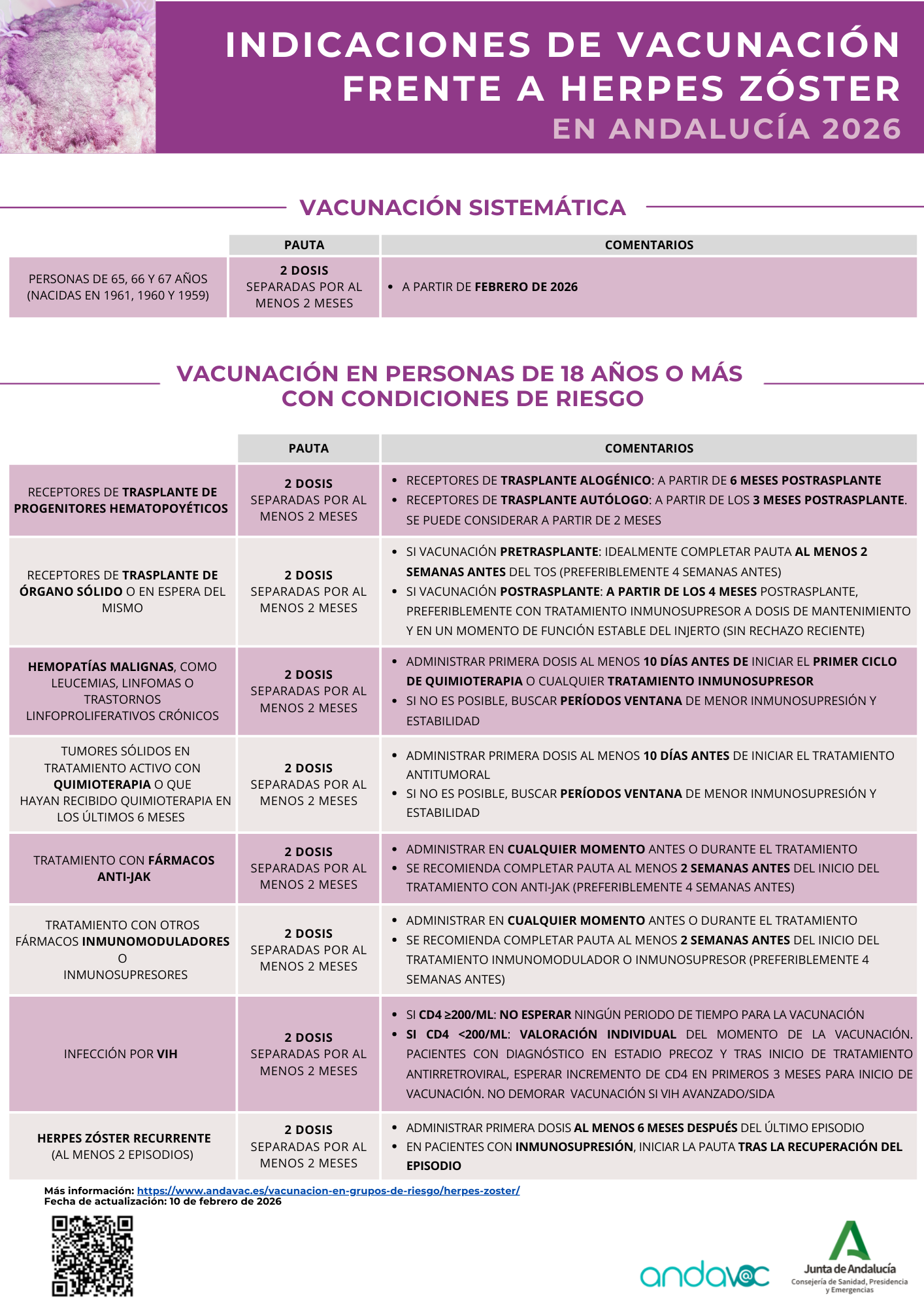 Actualmente en Andalucía, pueden recibir la vacuna frente al herpes zóster (Shingrix®) las personas de 18 años o más con alguna de las siguientes situaciones: